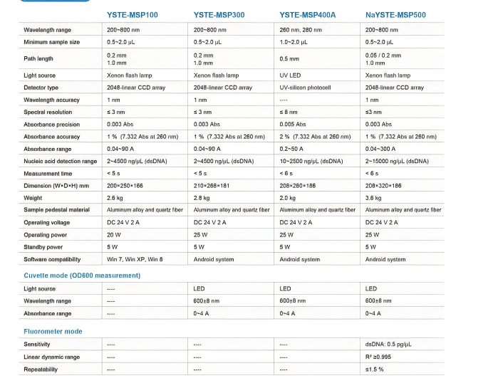 YSTE-MSP300 is a perfect full-spectrum, UV-Vis micro-spectrophotometer based on YSTE-MSP100 with full range of wavelength (200-800nm). Not only can it quickly and accurately detect nucleic acids, proteins and cell solutions with only 2 μl of sample like YSTE-MSP100, but it is also equipped with a cuvette mode to detect the concentration of bacteria and other culture solutions, and then determine the growth of bacteria. YSTE-MSP300 is added a new function of bacterium cell concentration test (OD600). YSTE-MSP300 uses 7-inch touch screen and is integrated with Android system, which do not need to connect to a computer. It can be efficiently and conveniently applied to various fields of life science, and has become a routine configuration instrument in many laboratories.